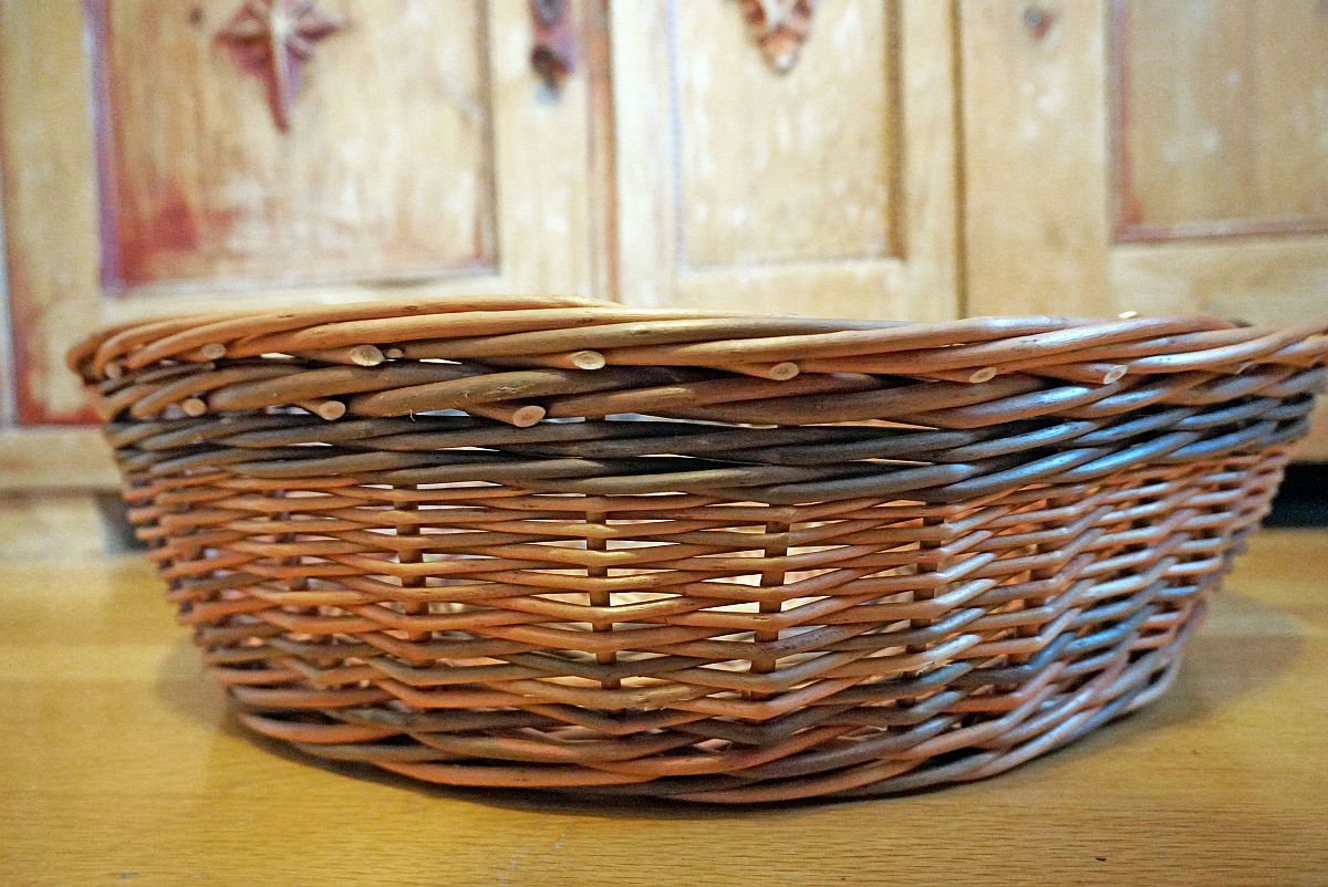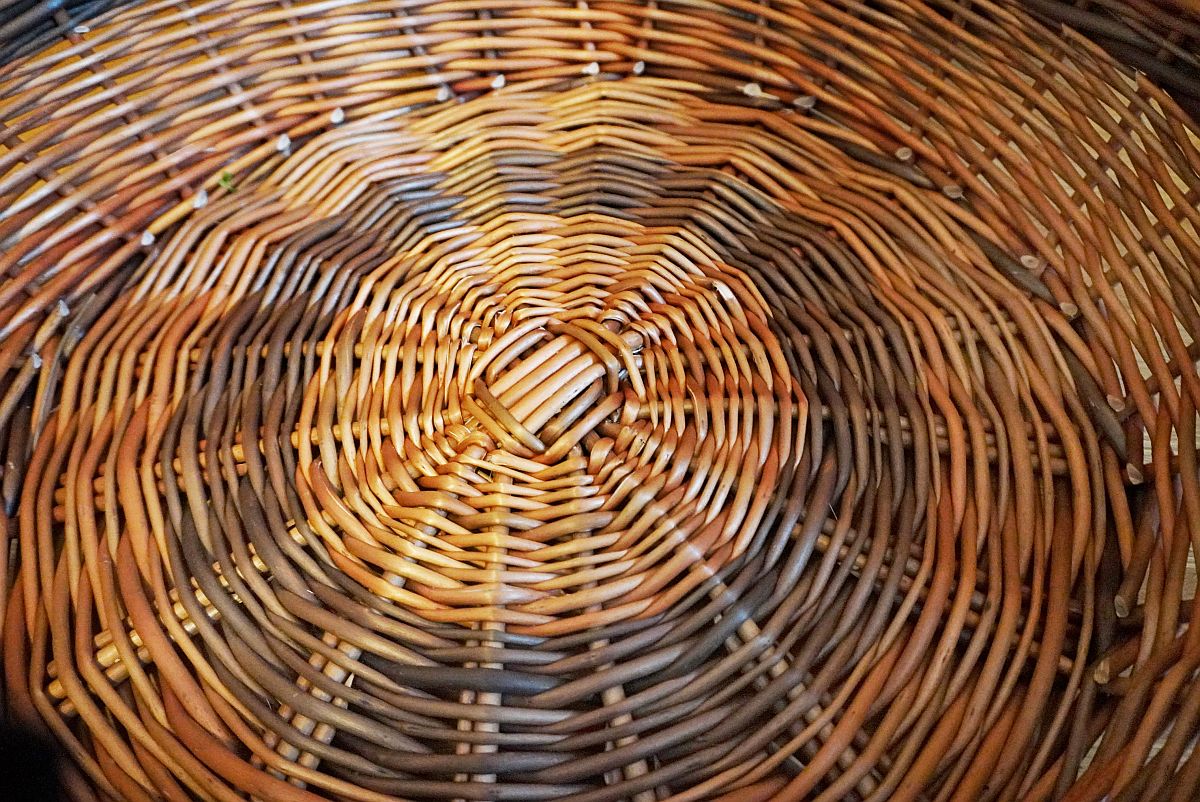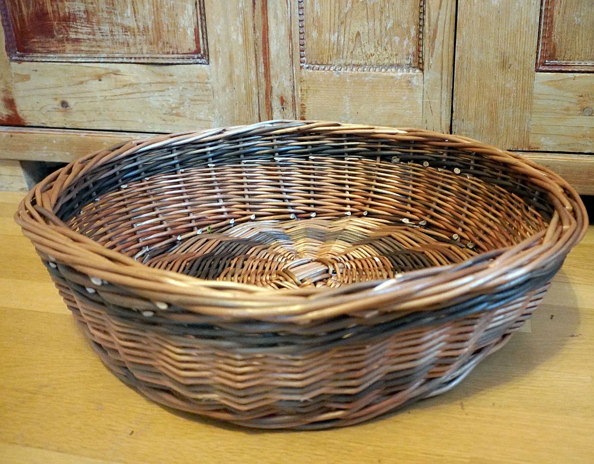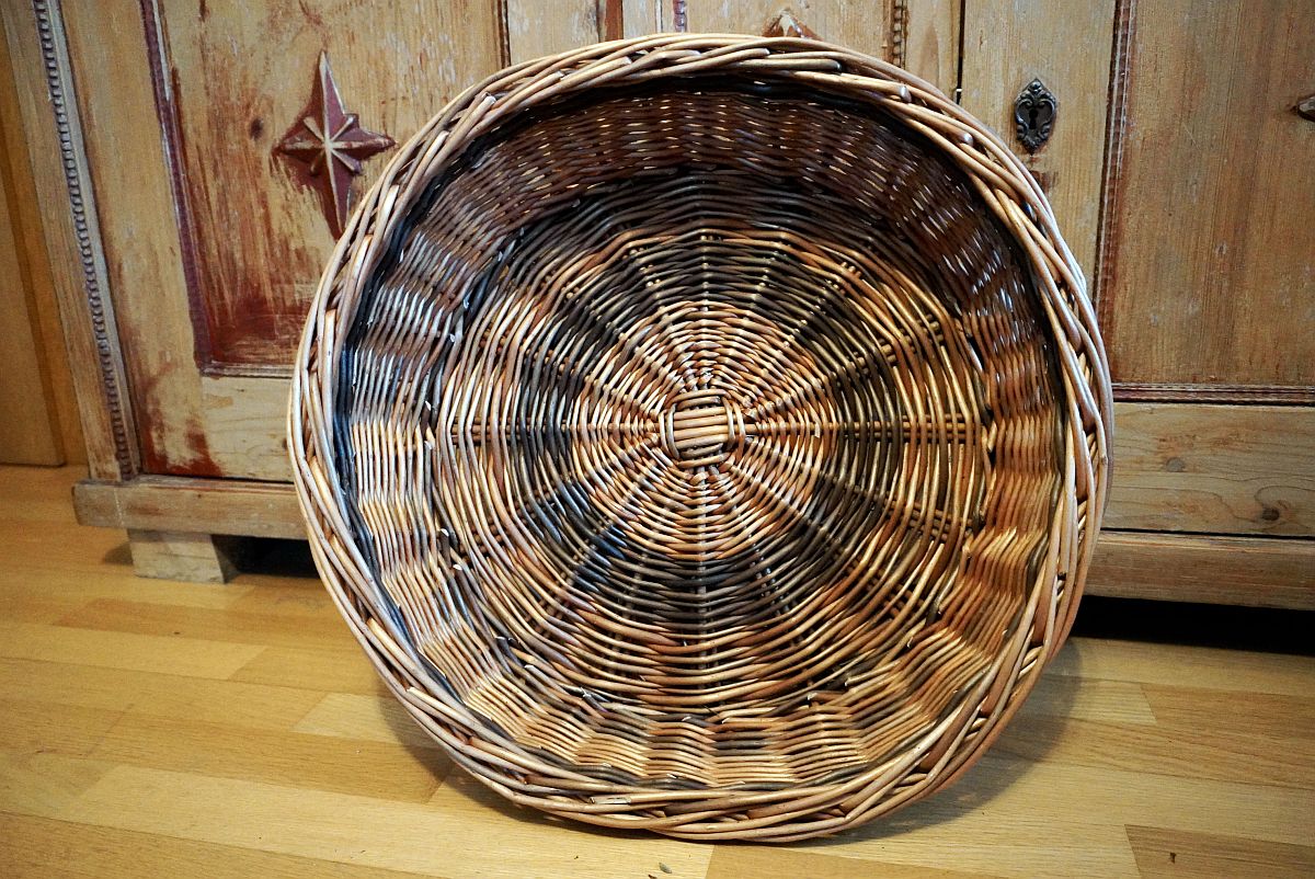 Ein großer Katzenkorb aus gesottenen Weiden. Im Boden und als Kimme auch dunklbraune gesottene Wieden verwendet.