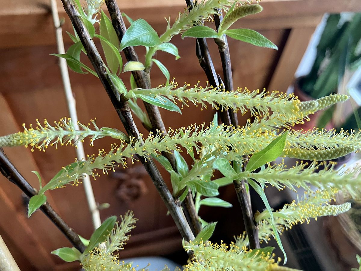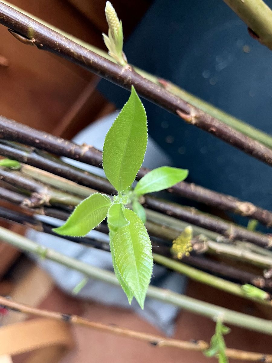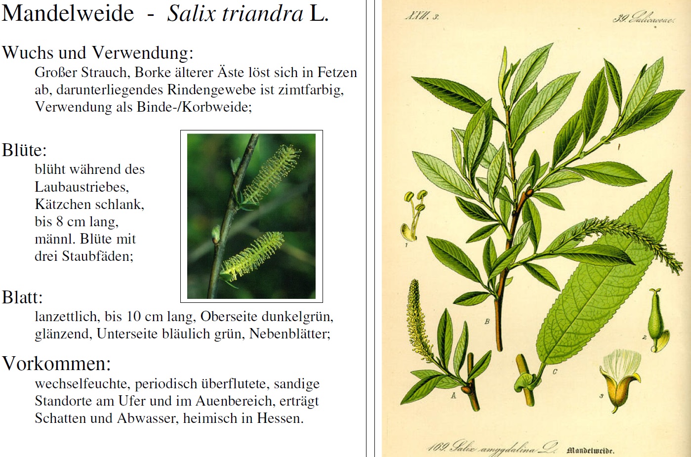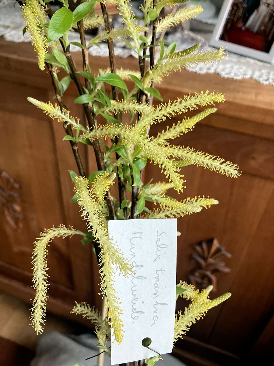 Ich hole meine Weiden ja in der Natur draußen an Bächen und Bauernhöfen. Deshalb kenne ich die biologischen Arten der Weiden zuerst mal nicht. Ich versuche dennoch die Arten zu bestimmen. Über die Blättern fällt es mir aber doch manchmal schwer: Lanzettartig, eiförmig, elliptisch. „5-9cm lang“ sagt nahezu gar nichts, weil die Spanne viel zu groß ist. Ein weiteres Merkmal sind die Blüten/Kätzchen. Die unterscheiden sich auch recht stark. Nur die sehen wir ja nicht an unseren Weiden, weil wir sie immer abschneiden. Ich habe nun einige Ruten mit nach Hause genommen und ins Wasser gestellt. Mein Beispiel: Kätzchen, lang, schlank, 3 Staubfäden. Ich tippe auf Mandelweide. Aber Vorsicht, es gibt männliche und weibliche Weiden.